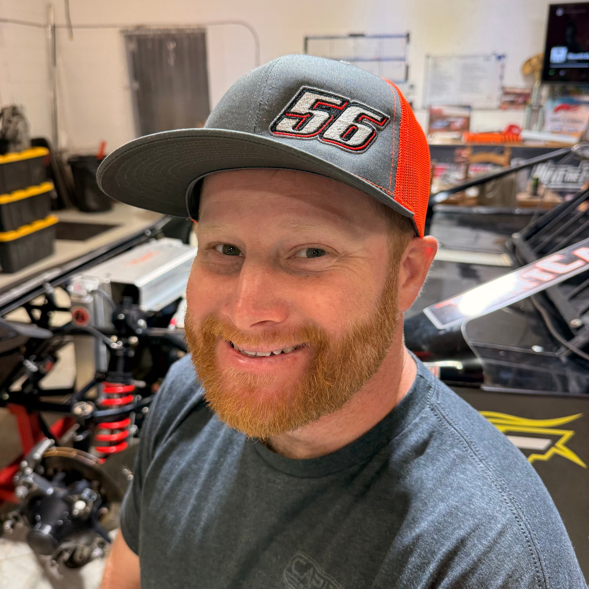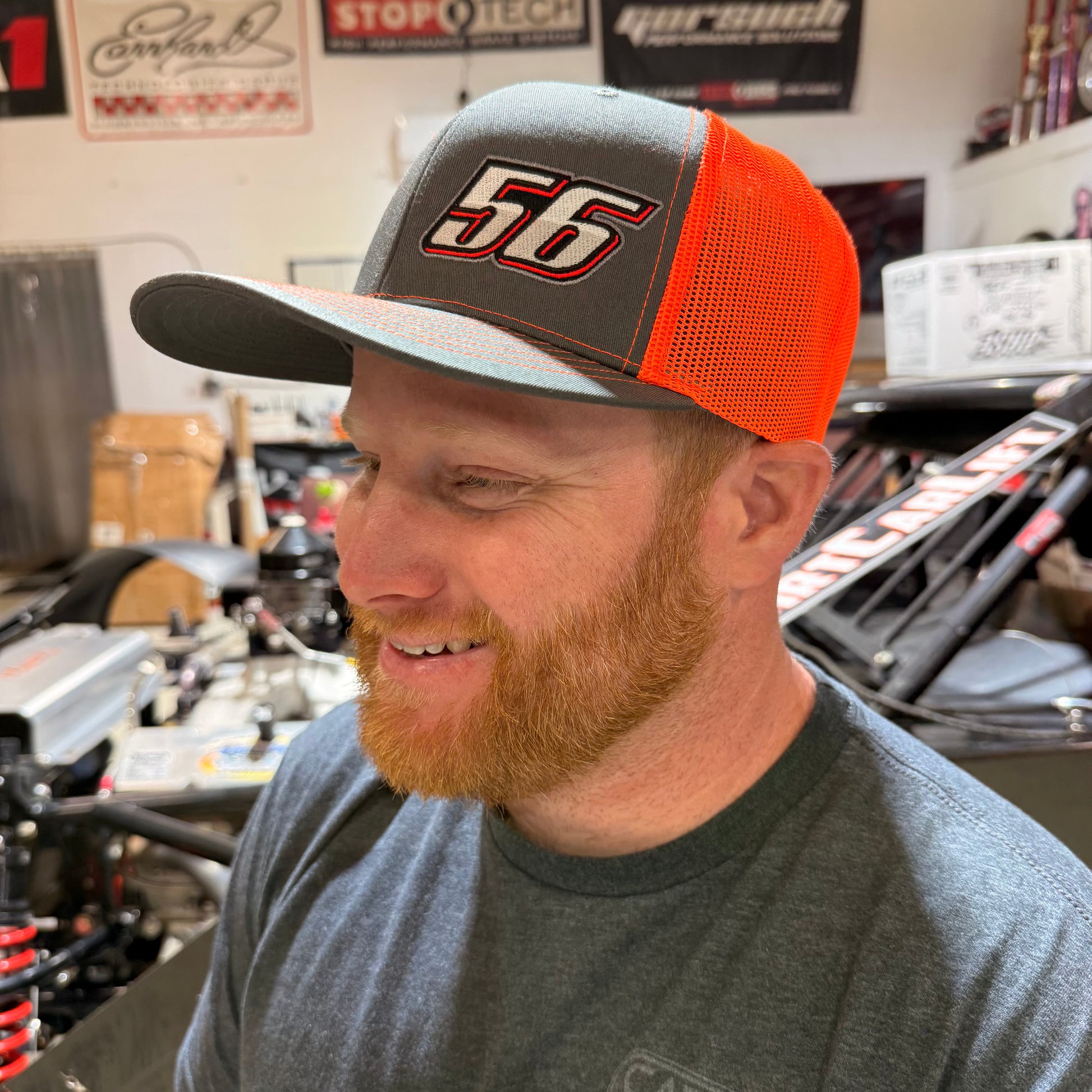 #56 Trucker Hat -- Charcoal front with orange mesh and charcoal bill.
